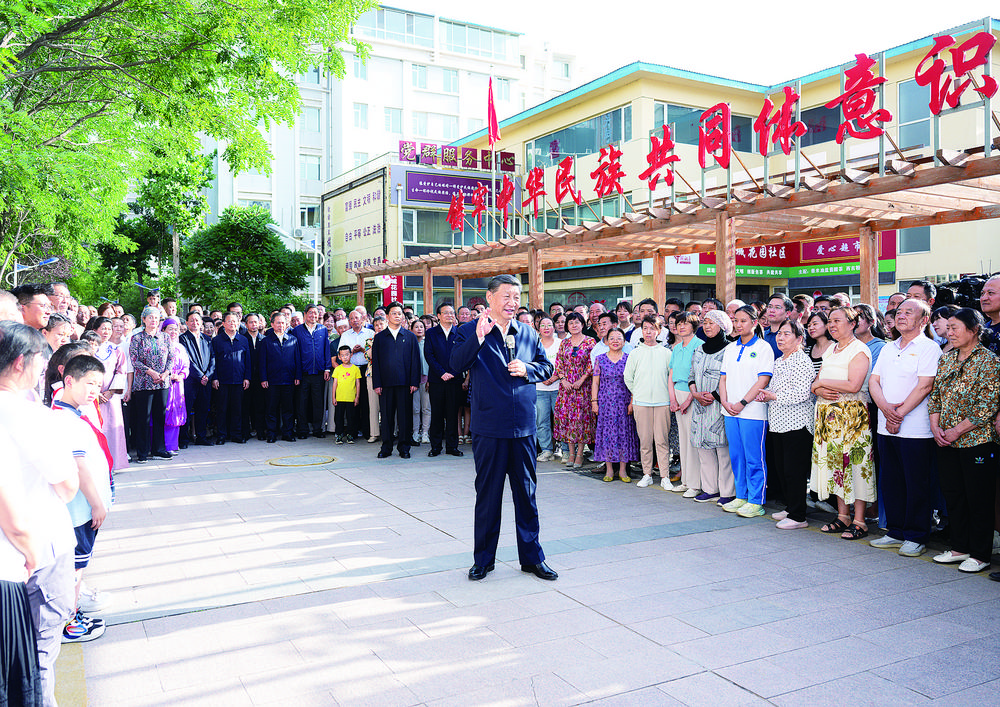 傍晚时分,社区广场十分热闹,居民们看见总书记来了,纷纷围拢过来,热烈鼓掌欢迎。习近平亲切地对大家说,时隔4年,我再次来宁夏看望各族干部群众,见到大家非常高兴!中华民族是一个大家庭,各族人民要像石榴籽一样紧紧抱在一起。要不断铸牢中华民族共同体意识,把各族人民的心紧紧连在一起,把各方面的力量广泛凝聚到一起,共同推进中国式现代化,共襄中华民族伟大复兴的盛举。