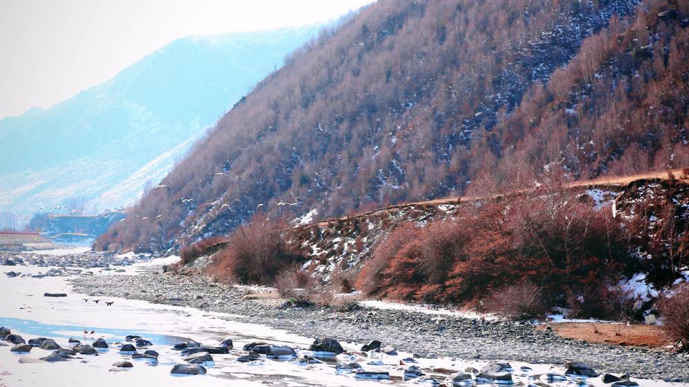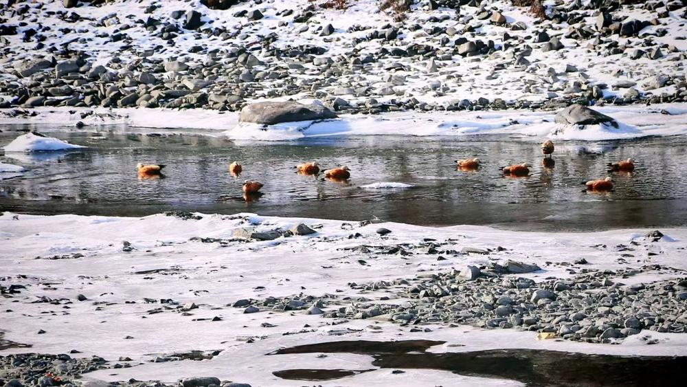 赤麻鸭暂时飞走了,力丘河的水声“潺潺”“汩汩”“淙淙”还延续着乐响,于湍急处又发出高而密集的“哗哗”声。浅浅的河面,薄薄的冰层,日照升温,冰面崩裂的声音也清脆地传到耳边。“咔”“嚓”“喀嚓”“咯吱”“砰砰”,像树枝折断,像鞭炮炸响,没有规律,没有节奏,偶尔吓得人心惊一下。