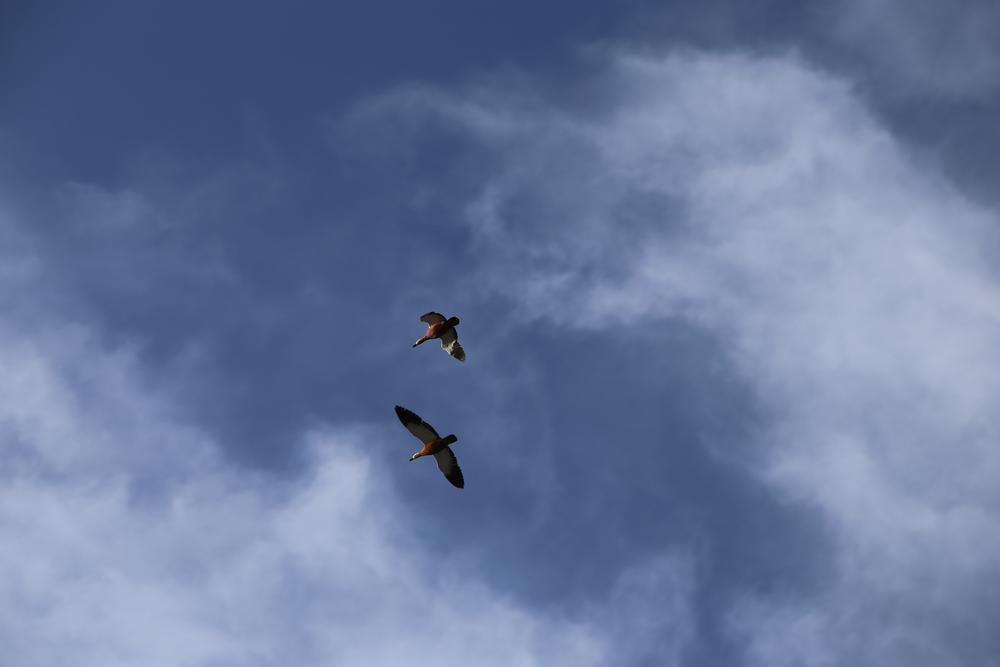 信步于力丘河堤岸,于水落石出间,觅得赤色的麻鸭成群嬉戏于水中。“哇哇”“嘎嘎”声此起彼伏,不噪也不喧。刚想靠近看得分明一些,就惊起了它们。首先是一两只“扑棱,扑棱”着翅膀从水面飞起,接着就是成双成对一群群“扑啦啦”飞起。扑翅拍打水面和空气的声音,与鸣叫声合奏在一起,蹿到高空去袅袅。它们沿河道上空从此处飞到别处,或上游或下游,有的还会划破小镇上空的蓝天,飞旋一圈,做“长空雁叫”。偶尔留下两只胆大忘情的,继续在河道里私聊,秀着恩爱,发出“咯咯”“咕咕”的声音。