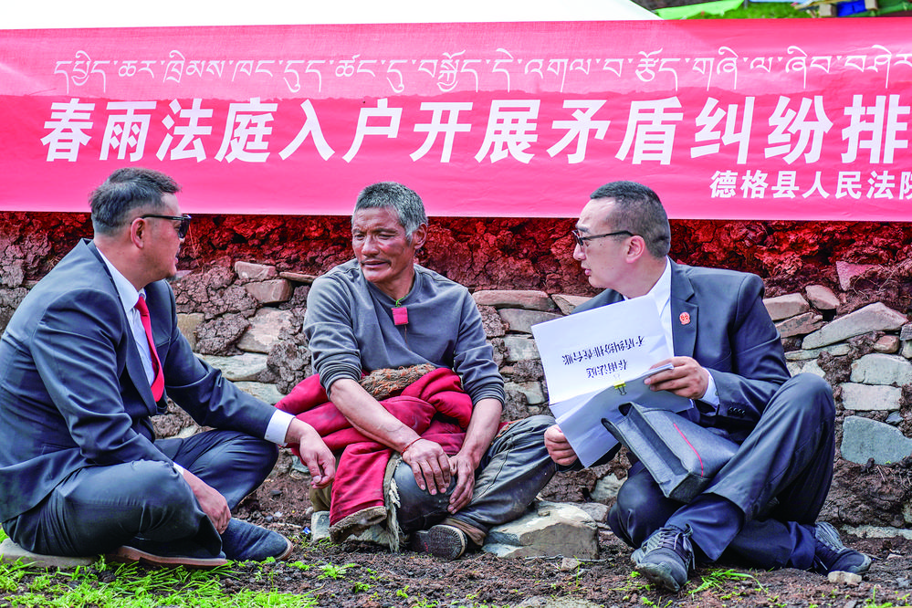 马尼干戈人民法庭立足民族地区实际,以“小法庭”服务“大民生”、融入“大治理”、推动“大团结”,探索出一条具有民族特色、德格特征的新时代司法路径。他们以“锚定实质解纷、注重强基导向、坚持民生至上、聚焦乡村振兴”四个目标为导向,在雀儿山以东片区,三名精通藏语的驻庭干警按时间表、路线图,以“就地排查+就地调解”解决问题型工作模式为核心抓手,用赤诚和担当守护一方安宁。