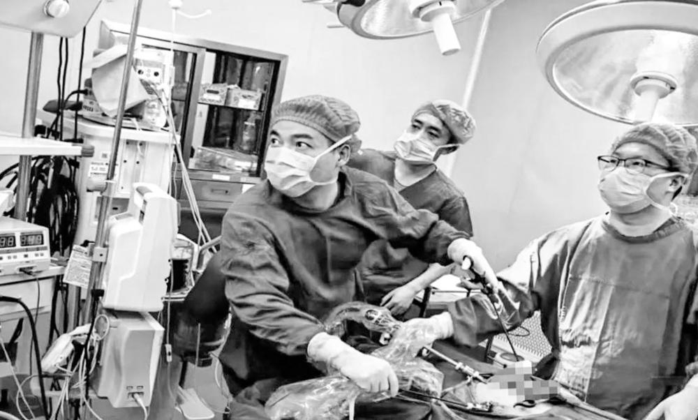 医生正在为患者做腹腔镜下卵巢包块剥除术。