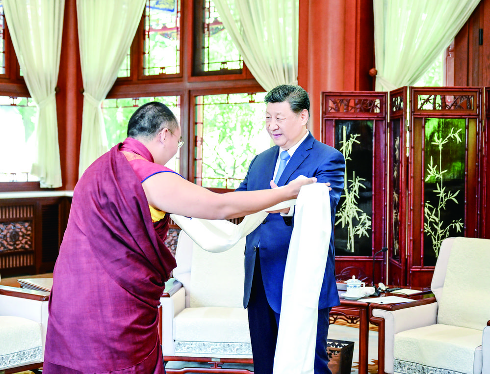六月六日,中共中央总书记、国家主席、中央军委主席习近平在北京中南海接受班禅额尔德尼·确吉杰布拜见。这是班禅向习近平敬献哈达。 新华社记者 谢环驰 摄