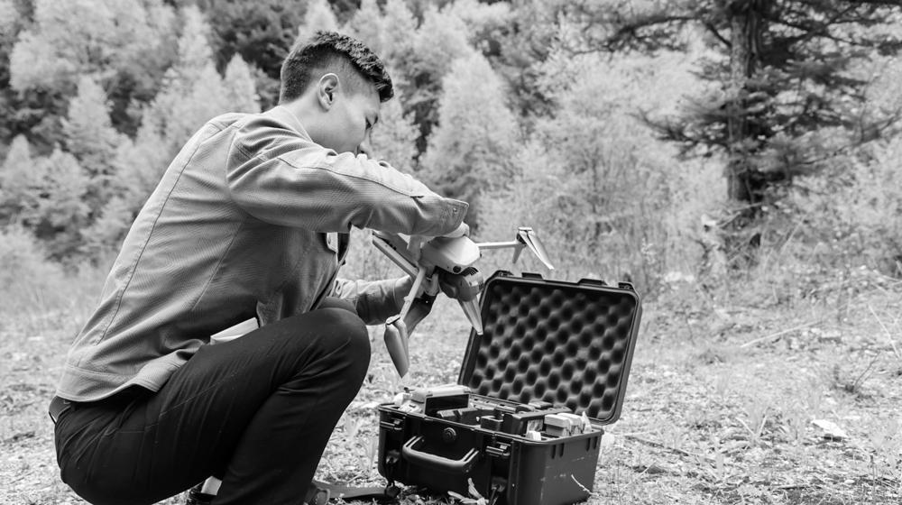 他新正在调试无人机。