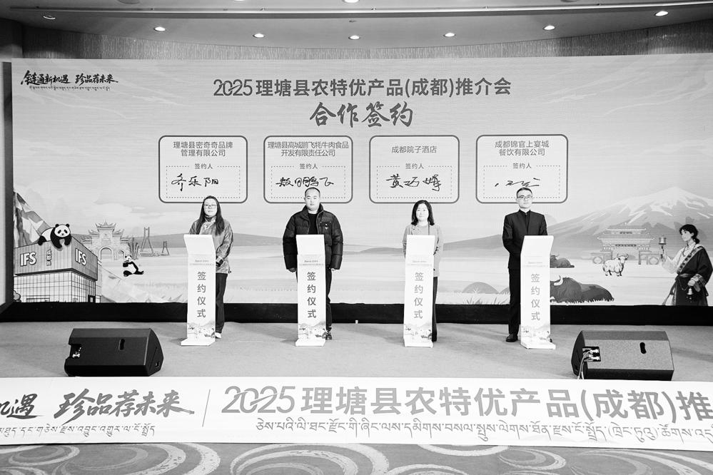 推介会在热情洋溢的开场舞蹈中拉开帷幕。来自理塘县的五家优秀企业代表依次登台,详细介绍了各类产品的特色与营养价值,展现了理塘产业的多元发展与创新活力。在产销合作签约环节,理塘县经济信息和商务合作局与多家成都企业签订了消费帮扶协议,理塘本地企业也与新都、金堂的相关企业达成产销合作,意向协议近1000万元。三轮签约仪式将活动推向高潮,标志着理塘与成都两地合作迈入新阶段,为农产品供应链的畅通与升级奠定了坚实基础。