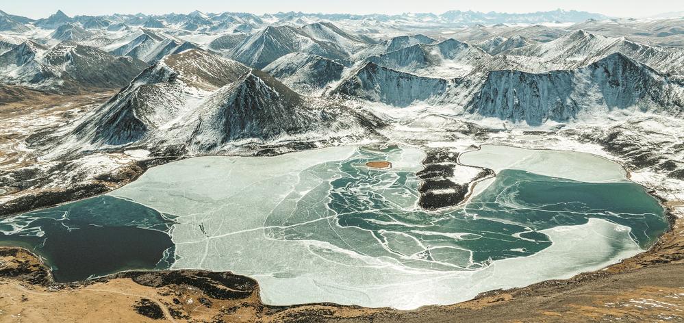 思金拉错位于拉萨市墨竹工卡县日多乡东南、山南市桑日县增期乡以北,湖面海拔约4500米。 冬日,思金拉错湖面结冰封冻,冰湖雪峰相映成趣,构成一幅洁净的冬日画卷。 这是12月13日拍摄的思金拉错冬日风光(无人机照片)。 新华社记者 丁增尼达 摄 200_04B_20251215