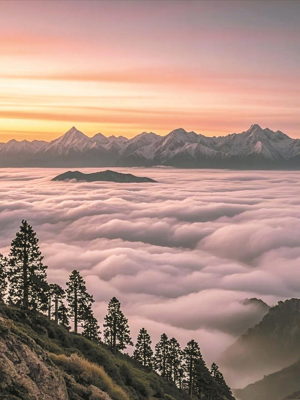 牛背山以云海、日照金山闻名,每年秋冬季空气通透是拍壮丽云海的黄金时段,受冬季低温影响云层更显厚重,洁白清晨或傍晚云海在山谷中翻腾涌动,时而如波涛汹涌、时而如棉花糖般轻柔,将牛背山环绕其中仿佛置身仙境。