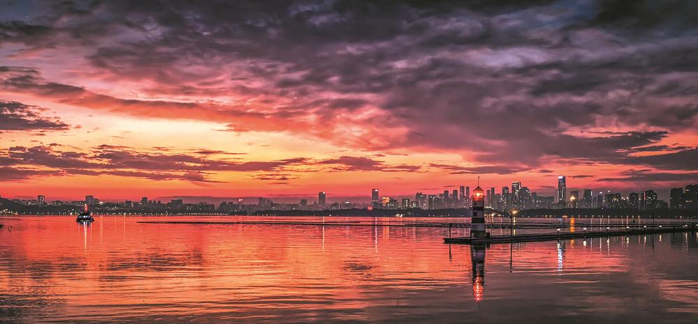 大江东去,极目楚天。武汉的水域面积约占全市总面积的四分之一,166个湖泊星罗棋布,165条河流蜿蜒曲折,淌出16.24万公顷的湿地面积,长江汉江江水漫流,雕琢出“江城”模样,塑造了“大江大湖大武汉”的城市符号。冬季在江城水域赏日出日落,杳杳长空,意境悠然。