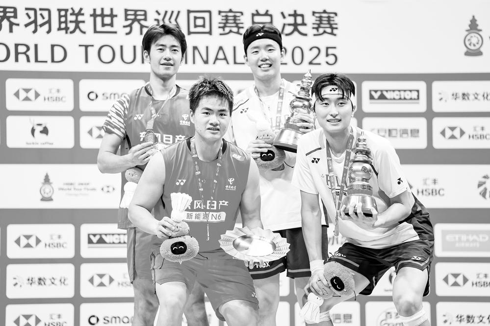 12月21日,在杭州进行的2025世界羽联世界巡回赛总决赛男子双打决赛中,中国组合梁伟铿/王昶0比2不敌韩国组合金元昊/徐承宰,获得亚军。 图为冠军韩国组合金元昊(右下)/徐承宰(右上)和亚军中国组合梁伟铿/王昶(左上)在颁奖仪式上。 新华社记者 江汉 摄