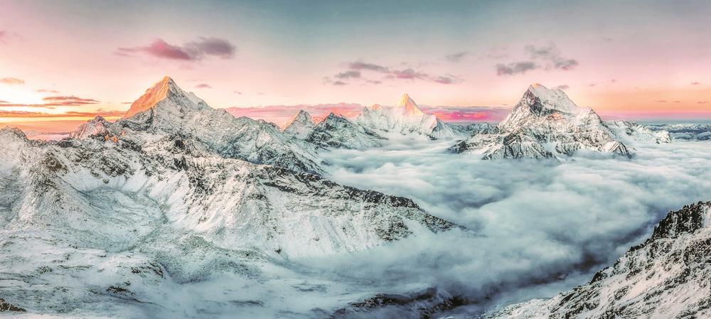 稻城亚丁景区内仙乃日、央迈勇、夏诺多吉三座雪山呈“品”字形排列,山体高耸入云,为阳光直射雪顶提供了天然条件。其所在区域空气相对洁净,且常伴有云海或薄云。云海的存在进一步增强了光线的反射和散射,为“日照金山”增添了层次感和神秘感。