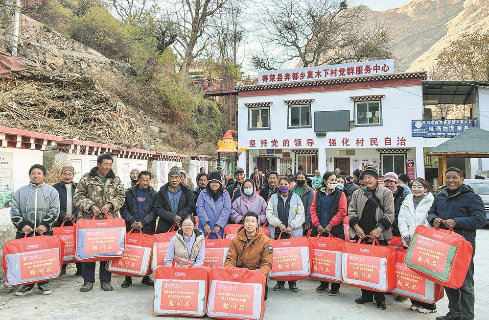 成都中医药大学公共卫生学院与莫木下村党建结对,如清泉注入沃土,滋养出朵朵惠民之花。结对后的第一件事便是落实“温暖连心”行动。崭新的冬被送至村中每一户家中,那一床床厚实的棉被,不仅抵御了高原刺骨的寒风,更暖了人心。村民们接过棉被时,脸上洋溢着感激的笑容,这份温暖,让他们在寒冷的季节里感受到实实在在的关怀。