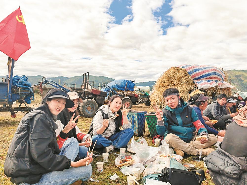 黄烟村大学生群众工作服务队秋收间隙吃午饭。