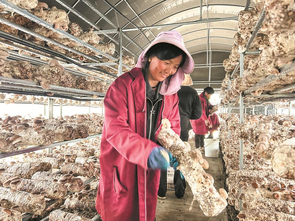 农户正在娴熟地采摘菌菇。