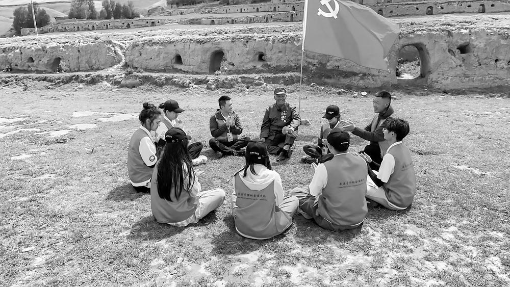 多加老人在十八军窑洞群前与青年学子畅谈革命经历。