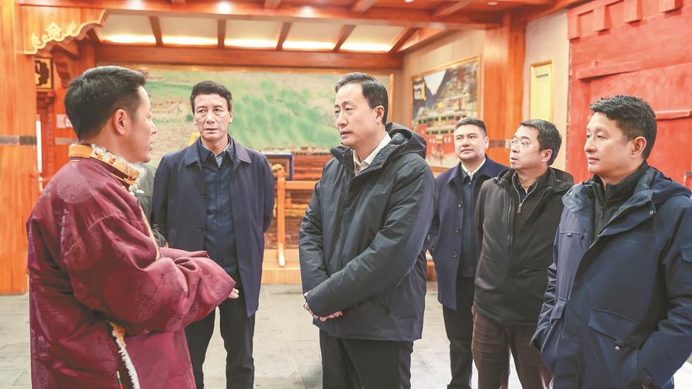在被誉为“藏族文化大百科全书”的德格印经院,赵波仔细查看经版保存、古籍修复工作,强调要坚持保护第一、传承为本,用科技手段守护文化遗产,加强传承人队伍建设,做好典籍抢救整理,让千年藏文化在新时代焕发新生机。在德格县俄支寺,他深入了解寺庙历史、文物保护等情况,(下转第四版)