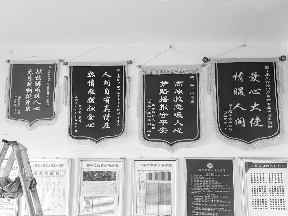 在养护站的一面墙上,还挂着另外几幅锦旗,都是得到王康洪帮助的游客赠送的。其中一幅写着“爱心大使,情暖人间”,锦旗背后的故事让王康洪至今记忆犹深: