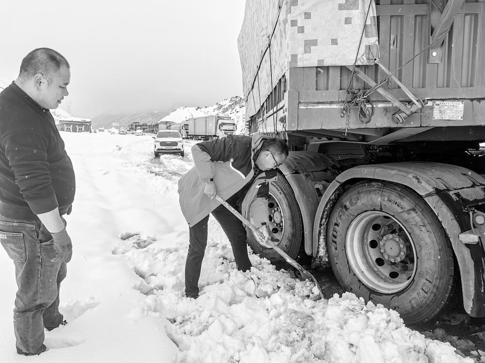 天刚蒙蒙亮,山上的贡布卡公路养护站里机器轰鸣。王康洪和同事们开着多功能除雪车,装好铁铲等工具上山除雪保通。在清扫完道路积雪后,还没等擦拭额头的微汗,王康洪便拿起手机拍起了视频。