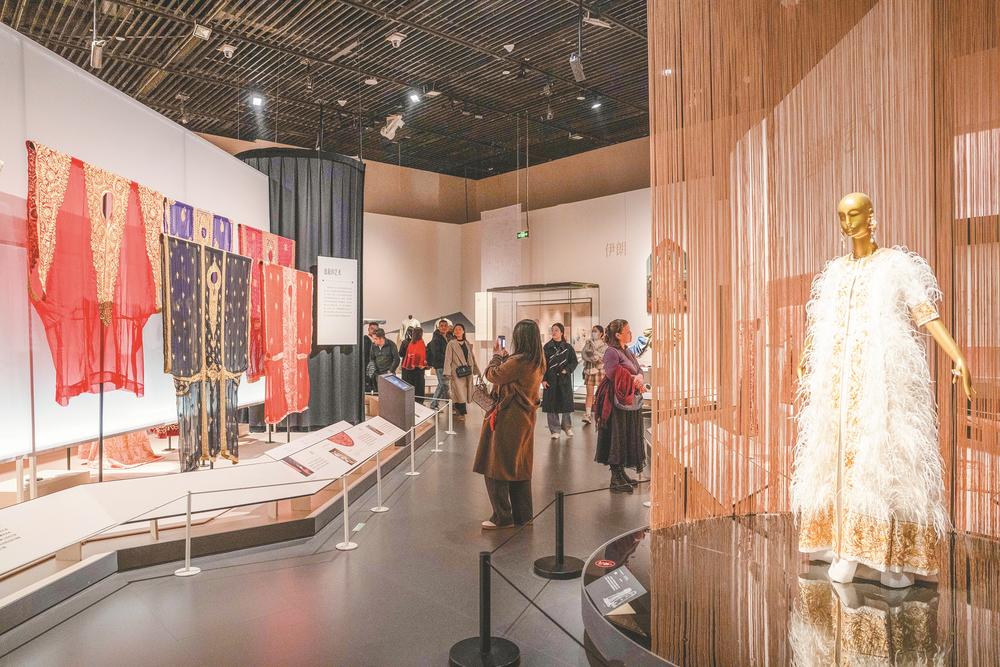 由成都博物馆与法国凯布朗利博物馆联合主办的“金线——从北非到东亚的黄金服饰风尚”特展正在四川省成都博物馆举行。展览汇集了来自7家法国文化机构的200余件/套织金珍品,以及8家国内文博机构的珍贵藏品,通过织金技艺、服饰艺术、审美源流等多维视角,串联起亚非欧文明,全方位展示黄金与服饰文化的交相辉映。图为1月13日,观众在成都博物馆参观展览。