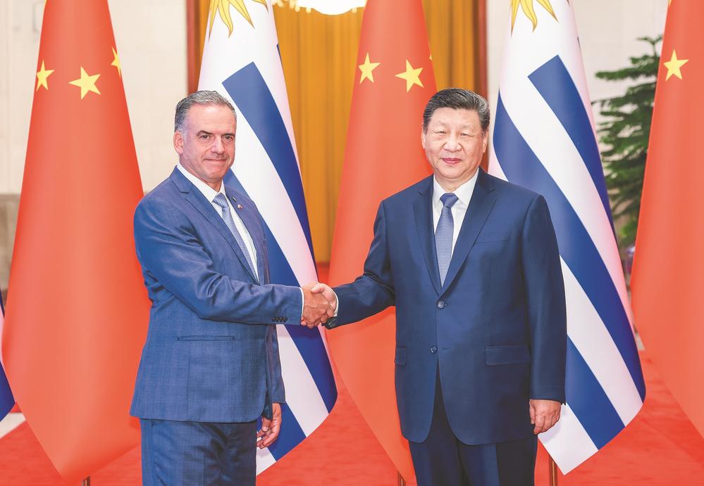习近平指出,当今世界正处于百年未有之大变局,国际形势变乱交织,单边霸凌愈演愈烈,中方支持乌拉圭接任“77国集团和中国”轮值主席国,愿与乌方加强全球南方团结协作,共同推进平等有序的世界多极化、普惠包容的经济全球化,(下转第四版)