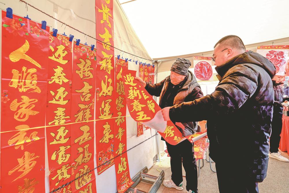 近日,河北省涿州市新春集市热闹非凡,市民们赶大集、办年货,迎接新春佳节。图为2月6日,市民在集市上选购春联。 新华社记者 卢烨 摄