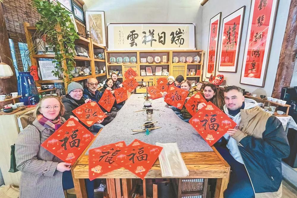 2025年12月,入境旅游策划师孙姝俐团队带领外国游客在北京大栅栏街区体验中国书法。 新华社记者 周心怡 摄