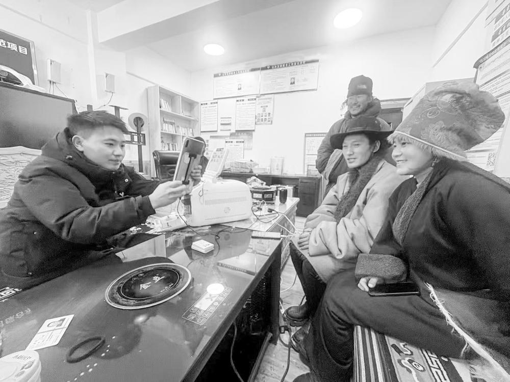 抵达村委会时,阳光刚爬上雪山尖。活动室里,“流动柜台”已搭好,移动设备整齐摆放,申请表单和金融知识宣传折页分类放好。不一会儿,穿着传统皮袄的牧民们陆续走进来,拍照、填表、核验、激活,流程在汉藏双语间流畅推进。忙过一拨,曲措瞥见手机——已是下午两点。“今年回村子的群众多,我们还得多加把劲。”说话间,呵气成霜。