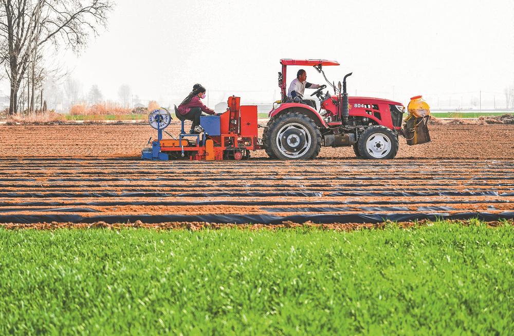 时下正值春季农事关键期,各地农民抢抓农时,开展春耕作业,田间地头一片忙碌景象。图为3月25日,河北省石家庄市行唐县南桥镇农民驾驶农机种植芋头。 新华社 发