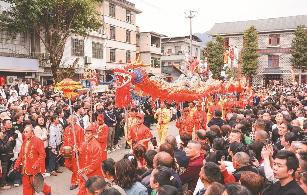 3月21日,在四川省兴文县大坝苗族乡晏州社区,龙灯队开启大坝高装非遗巡游。