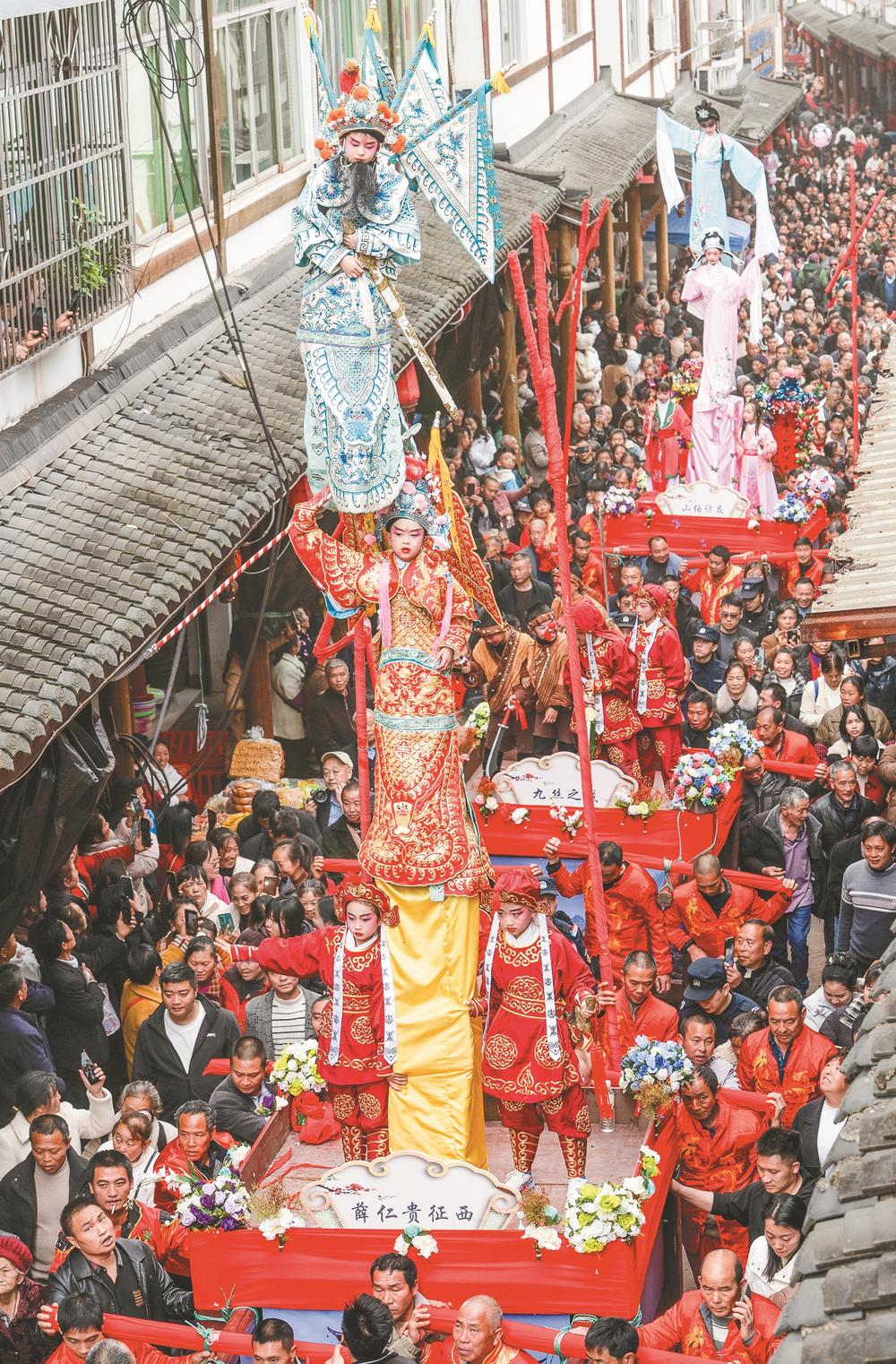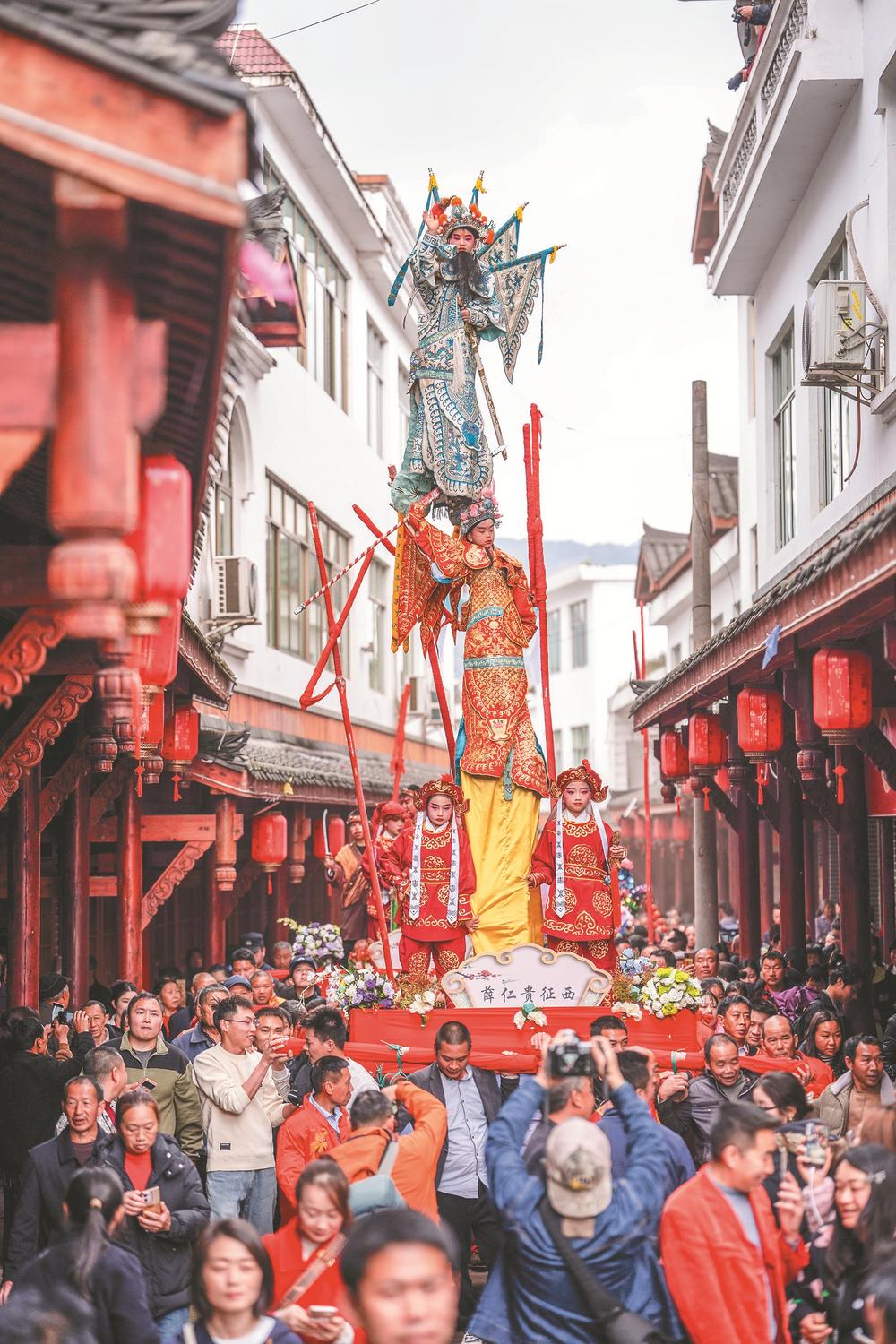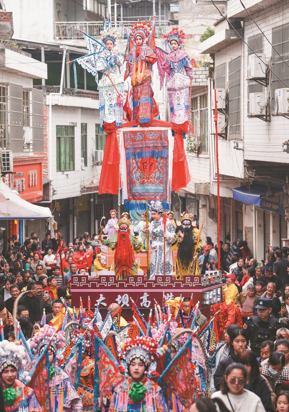 3月21日,四川省兴文县大坝苗族乡晏州社区,演员在巡游活动中表演大坝高装《穆桂英挂帅》。