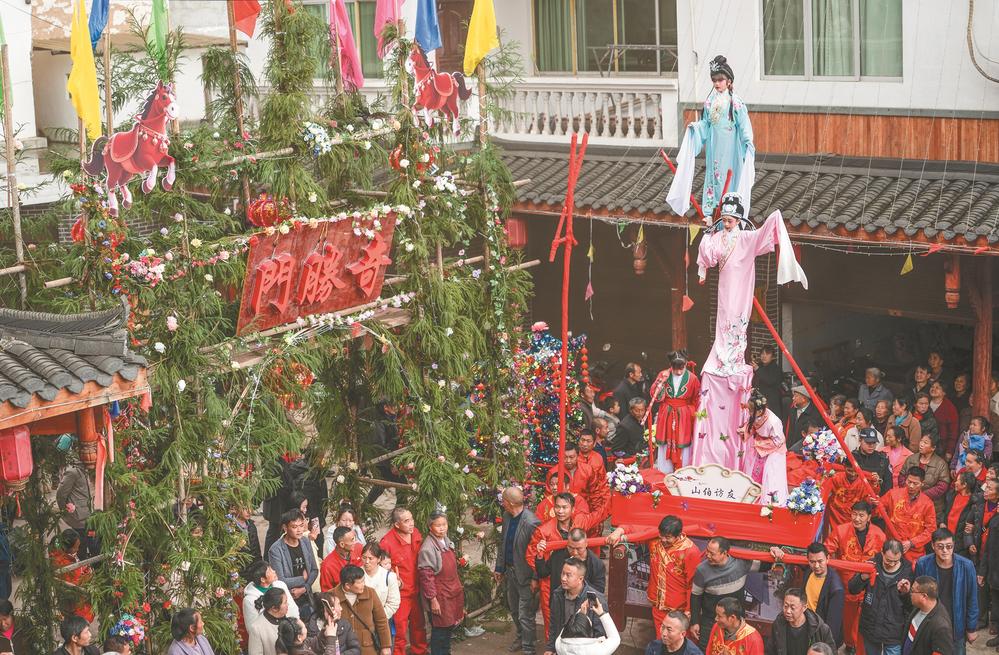 3月20日,四川省兴文县九丝城镇建武村,演员在巡游活动中表演木台铁桩戏《山伯访友》。