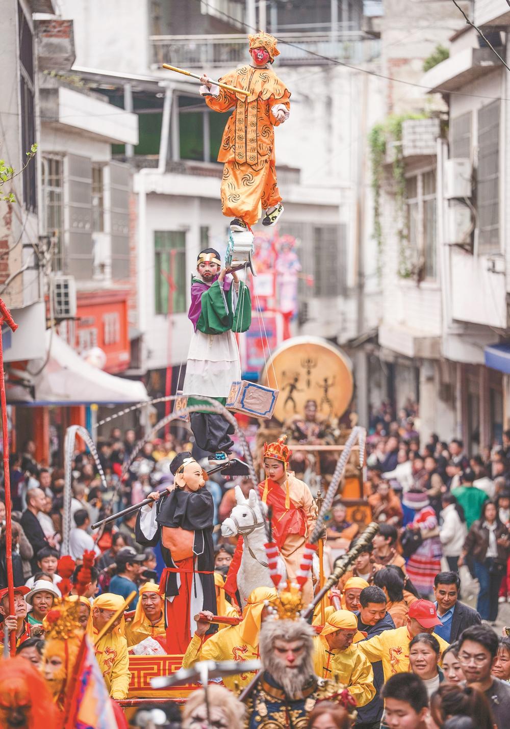 3月21日,四川省兴文县大坝苗族乡晏州社区,演员在巡游活动中表演大坝高装《西游记》。