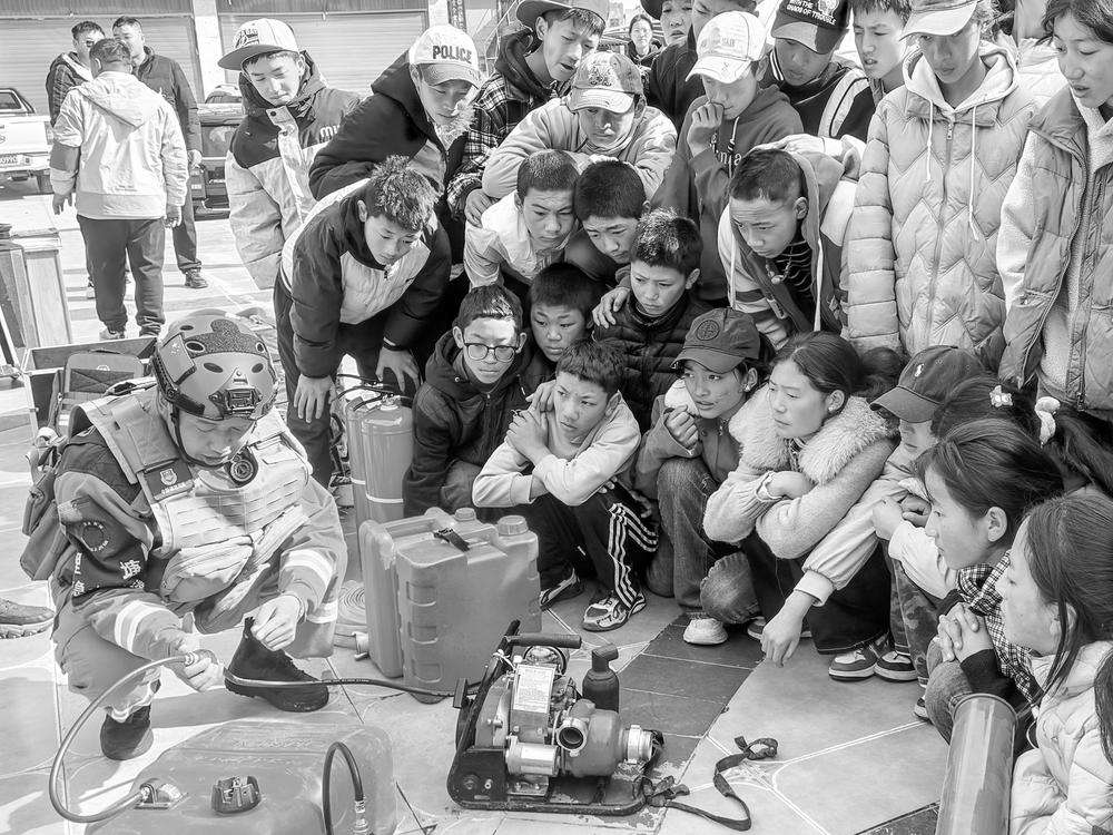 图为消防救援人员给学生现场演示防火机具操作。
