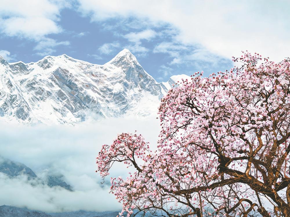 再看那树干,粗壮得令人咋舌,需五六个成年人手拉手才能勉强围抱住。皲裂的树皮刻满岁月的纹路,似老人布满皱纹的手掌,却依旧苍劲挺拔,撑起一片繁花似锦。树旁还有一株稍小的木兰,两树相依,繁花次第绽放,姹紫嫣红,恰似朝霞漫卷,与远处的雪山相映,与周遭的林海相融,美轮美奂,构成一幅错落有致的春日画卷,让人看得眼睛都挪不开,只剩满心的惊叹与欢喜。