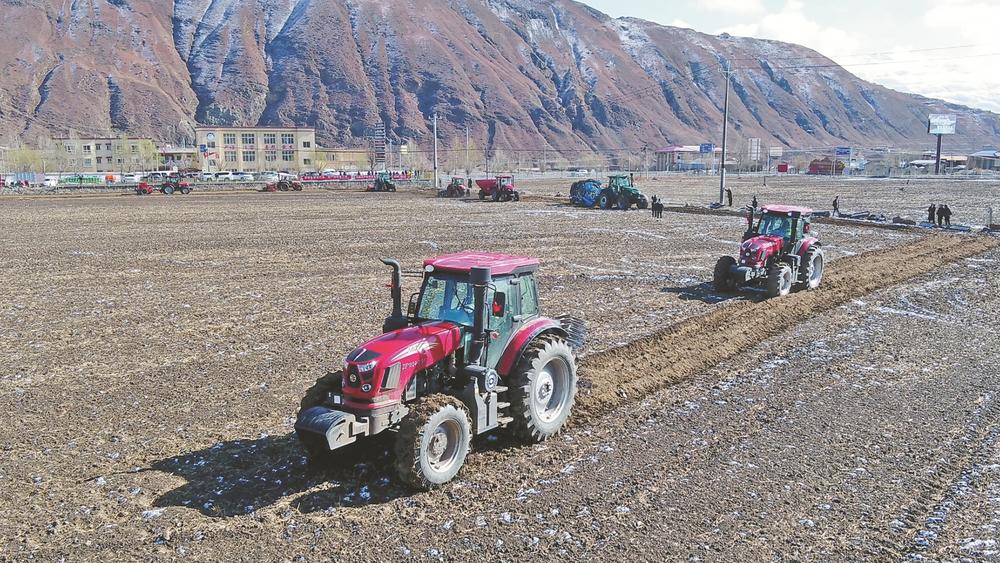 9时30分,随着现场指令发出,捡石机率先驶入田地,将散落在地表的小石块和杂物悉数清理。随后,大型翻转犁、撒肥机、整地机、播种机依次作业,在平整的土地上精准撒下有机肥,并播下“康青9号”“康青11号”等优良青稞品种。从耕整地到播种,从农资运输到田间管理,一套完整的青稞全程机械化作业流程展现在与会者面前。