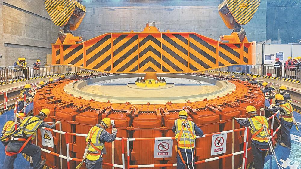 拉哇水电站首台机组转子成功吊入机坑。受访者供图