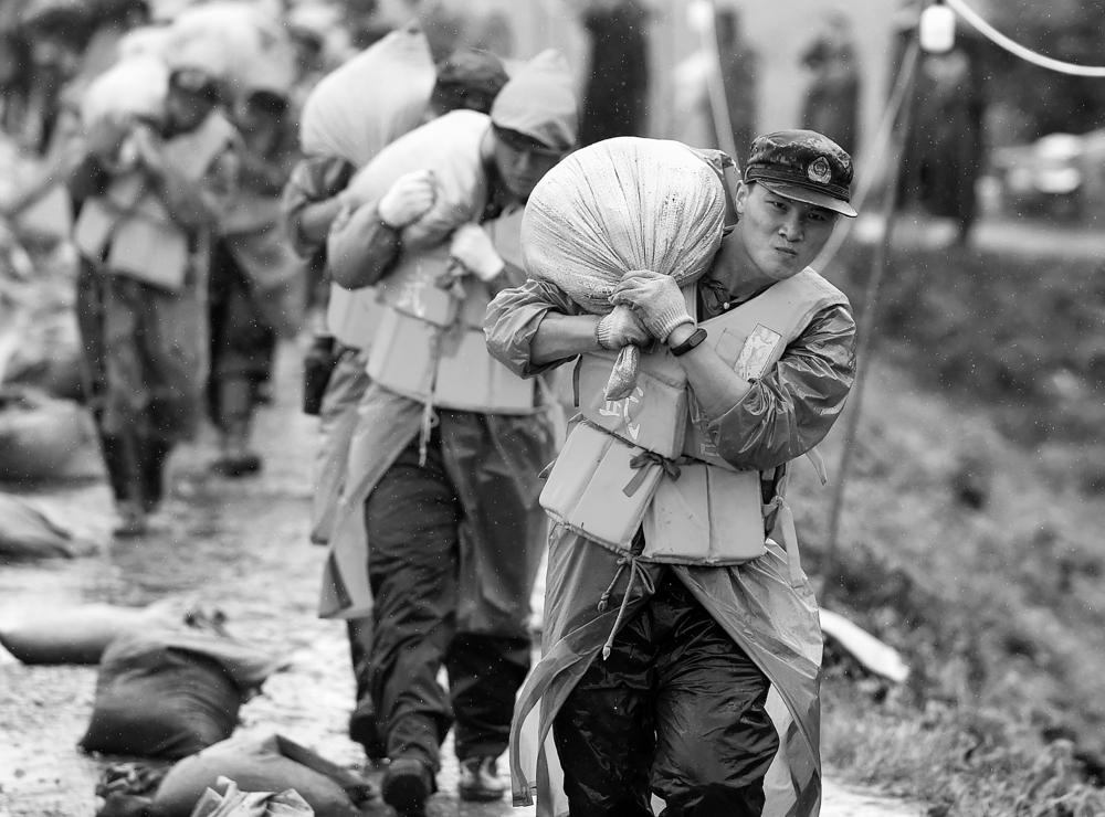 受连日强降雨影响,安徽省芜湖市鸠江区白茆镇的三垄圩部分圩堤沙土流失,先期加固的子埂出现松动。接到险情后,武警安徽总队芜湖支队立即出动120名官兵展开抢险,加固子埂,保障无为长江大堤安全。图为武警官兵在搬运沙袋,准备加固子埂。
