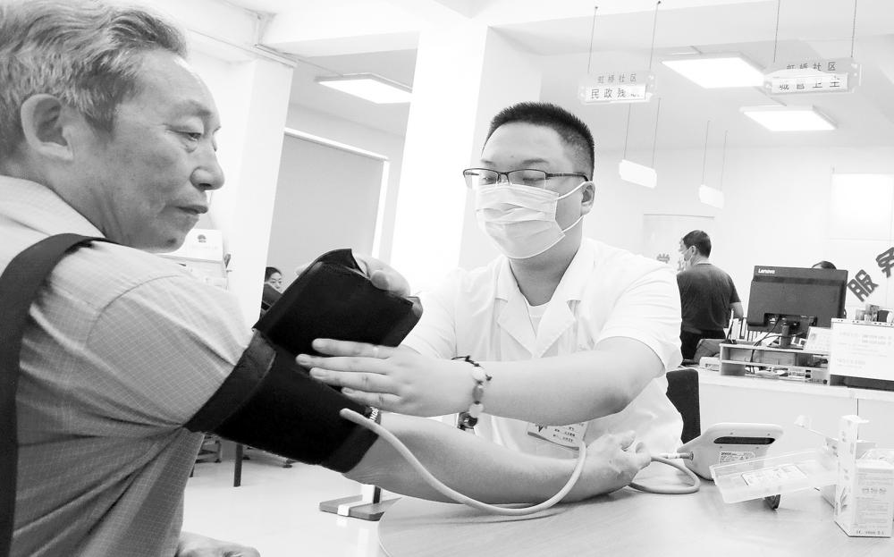 图为江苏省苏州市姑苏区金阊街道白莲社区卫生服务中心的一名医务人员正为居民量血压。 新华社 发