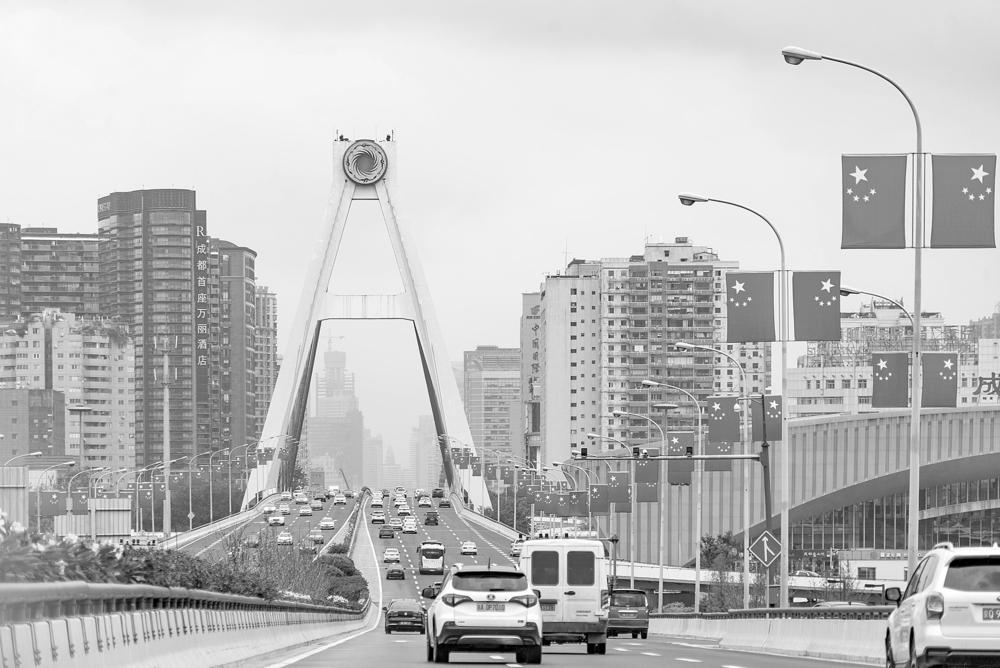 9月26日,成都市天府立交桥上挂满国旗,迎接国庆节的到来。 新华社 发