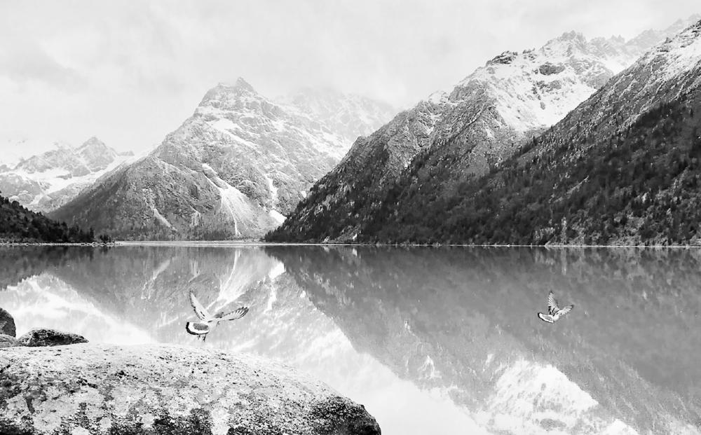 看一看远山的雪和近处的密林,雪峰阻挡了猛烈的风和冰冷的雪,葱茏的树才吮吸着自然的甘露守护着玉隆拉措,海天一色的天宇绯红的冬阳就这样把一切浸染得如痴如醉,间或的鸟鸣把冬的寂寥慢慢驱赶,总有一首歌在密林深处袅绕,那是珠姆的山歌,盼着远征的英雄走进牧场深处的帐篷,此刻松涛阵阵如战马嘶鸣,迎合着情歌的唱响在雪域之巅深情合拍。