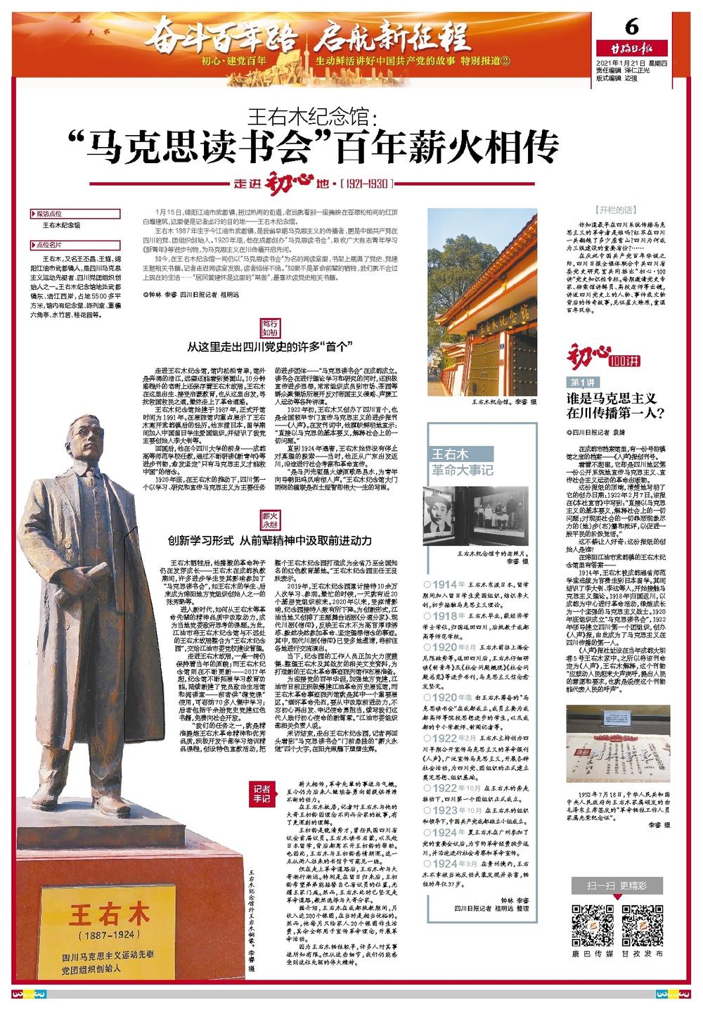 1914年,王右木被成都通省师范学堂选拔为官费生到日本留学。其间结识了李大钊、李达等人,开始接触马克思主义理论。1918年归国返川,以成都为中心进行革命活动,锻炼成长为一个坚强的马克思主义战士。1920年底组织成立“马克思读书会”,1922年领导建立四川第一个团组织,创办《人声》报,由此成为了马克思主义在四川传播的第一人。