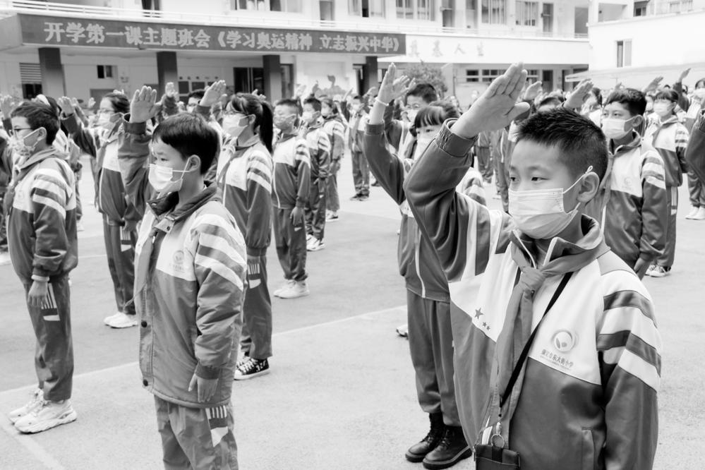 “起来,不愿做奴隶的人们……”当国歌响起,五星红旗冉冉升起,东大街小学的学生们抬头挺胸、庄严敬礼,表达着对祖国母亲的热爱和崇敬。记者了解到,为落实防疫工作,确保师生健康安全,在开学第一天,东大街小学规定六年级学生、新生及家长在操场举行升旗仪式,其余年级的学生在各班教室举行升旗仪式,除新生外其余年级学生家长不准进校陪同。