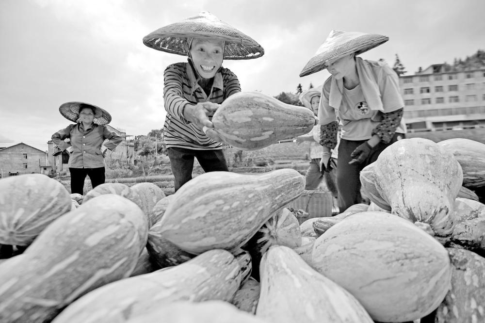 前三季度我国经济同比增长9.8% 保持恢复态势。 图为贵州省锦屏县钟灵乡钟灵村村民在整理香芋南瓜。 新华社 发
