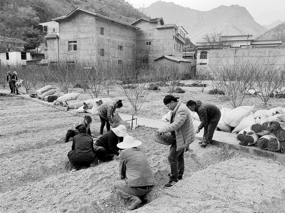 在康定市金汤镇新房子村,一大早,当地村民们就来到田间地头热火朝天地劳作,翻地、种植、浇水、施肥……每一步都有条不紊地进行着。“年前,我们就开始新发白芨苗种,现在天气暖和了就进行翻种和移栽。”新房子村村民谢祖明告诉记者,“以前我们把白芨和花椒树一起施肥、覆木土,导致花椒和白芨生长相互影响,产量相对较低。今年我们就改进了种植技术,在花椒树边不套种白芨,在距离花椒树60公分处才施肥覆土,这样花椒和白芨都有充足空间成长,互相不影响养分吸收。”