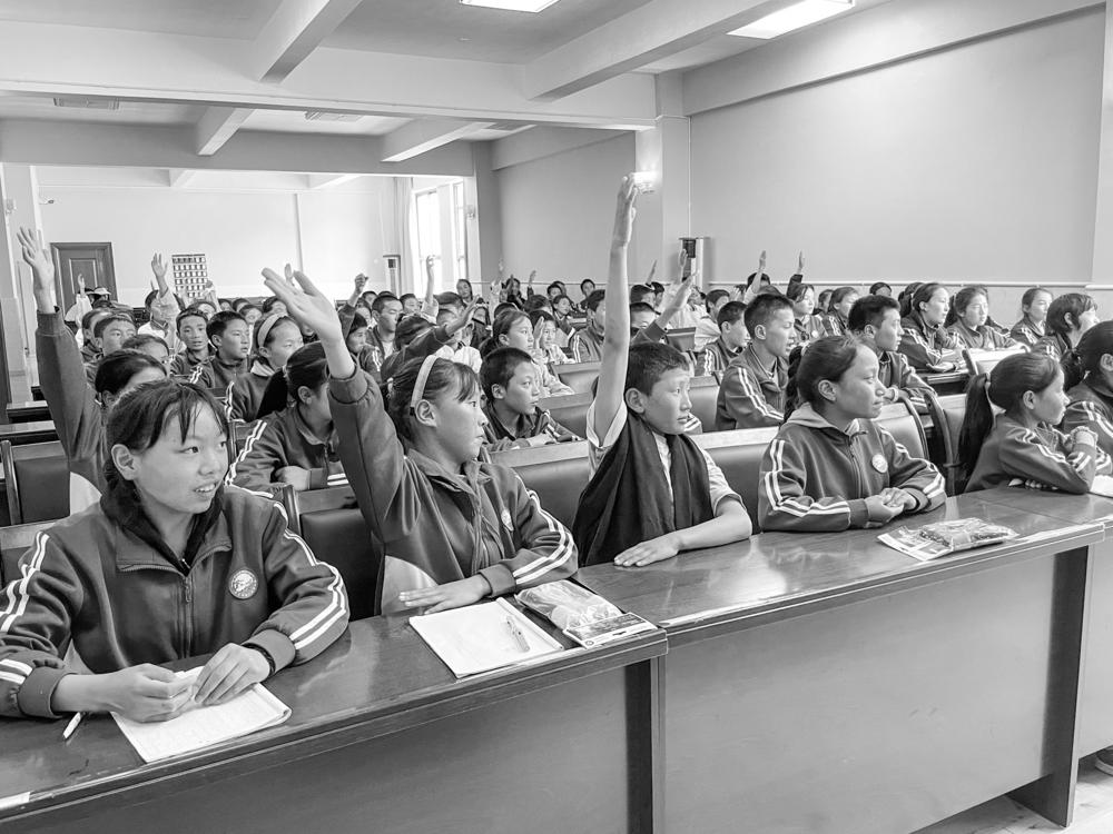 在第35个“6·26”国际禁毒日,白玉县人民法院正义雪莲女子审判团队到县第三完全小学开展禁毒宣传进校园专题活动,活动紧扣毒品的种类、吸毒的危害、如何远离毒品等内容,与同学们进行问答式互动交流,并为学生们送去禁毒知识大礼包。图为学生们踊跃参与交流互动。 白宣 摄影报道