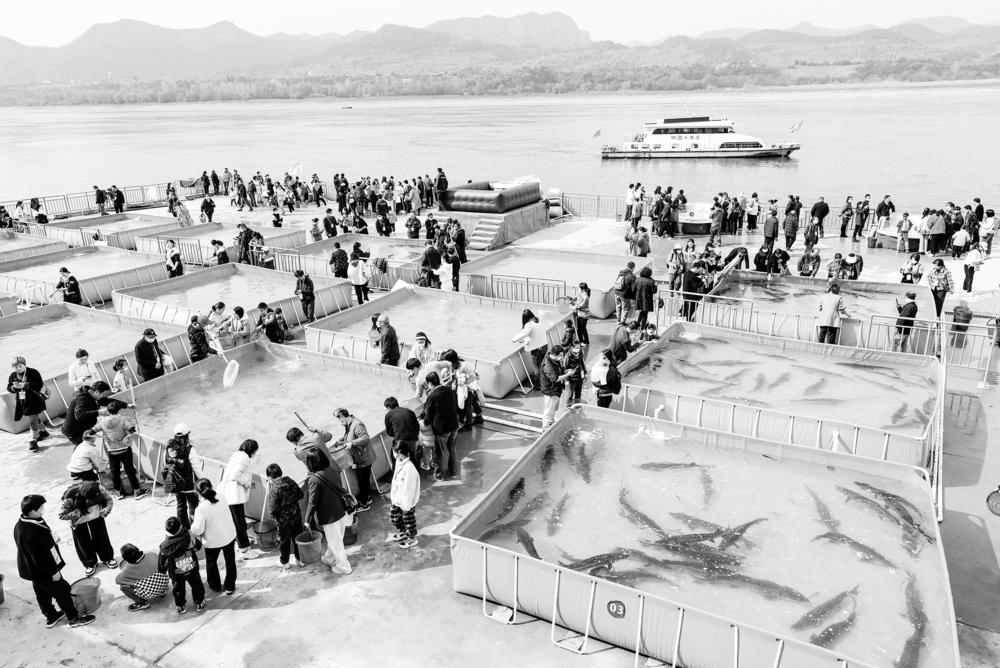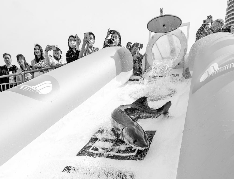 2023年长江三峡中华鲟放流活动3月25日至28日在湖北省宜昌市胭脂园长江珍稀鱼类放流点举行,活动期间分批次放流20万尾不同规格的中华鲟。这是三峡集团实施的第68次中华鲟放流,放流的中华鲟延续“中、青、幼”相结合的科学放流策略,可实现对中华鲟野外种群数量的补充和年龄结构的调节。图为3月26日在湖北省宜昌市胭脂园长江珍稀鱼类放流点拍摄的活动现场。