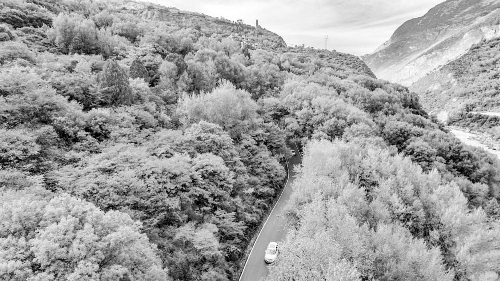 近日,丹巴县已开启“彩林模式”,乡间小路上行驶着来来往往的车辆。洛绒尼玛摄。