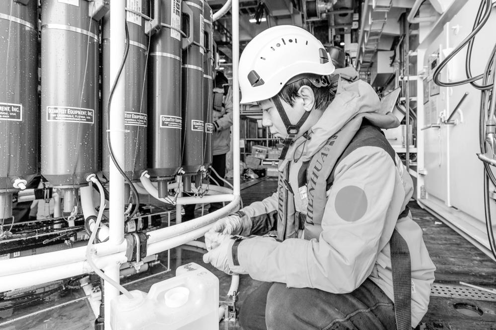 目前,中国第40次南极考察队正搭乘“雪龙2”号在阿蒙森海开展大洋考察。图为1月7日,考察队员在收集CTD(温盐深剖面仪)采集的海水样品。