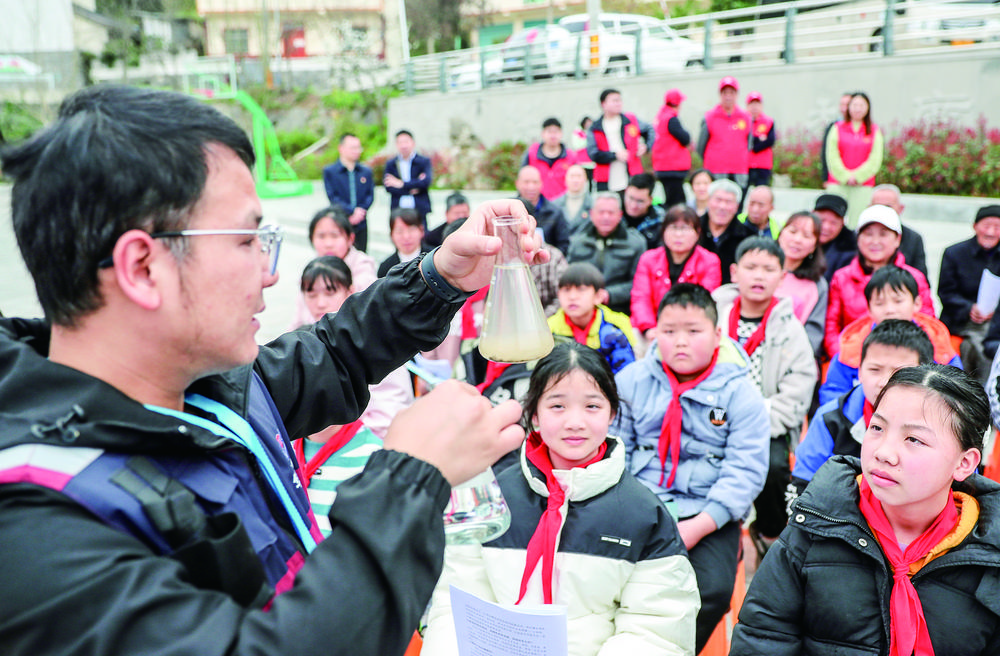 为迎接即将到来的世界水日,各地举办形式多样的主题活动,增强人们的节水护水意识。图为3月20日,四川省华蓥市疾控中心的志愿者在天池湖畔为学生讲解水质常识。 新华社 发