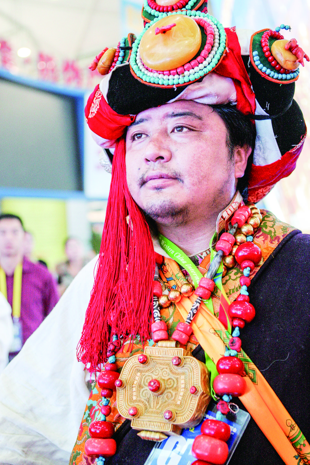 在传统习俗中,康巴汉子一般有“三件宝”,分别是头饰、护身盒和刀子,而西俄洛地区康巴汉子的头饰之华丽令人惊叹。他们都保留了康巴地区留长发的习俗,头发多用黑色丝缨盘成四瓣、六瓣、八瓣的莲花状,辫套上还会串上珊瑚、象牙环和金银质戒指为辫饰,戒指上镶嵌着珊瑚,最多镶有9 颗,象征太阳和明月。这些装饰物由于多为金银、玛瑙、珊瑚、象牙等贵重物件,甚至上面还有佛塔等造型的饰物。整个头饰在呈现硬朗之美的同时,也“相当有分量”。据介绍,当地康巴汉子的头饰,最重的能达到30多斤。