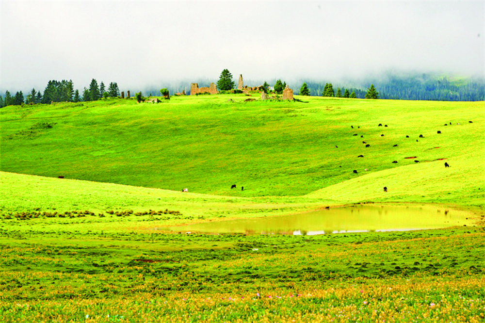 爬上山顶,一块壮阔的草原和两湾柔美的湖水,映入眼帘,为这片神秘的土地,增添了一份柔情。远远望去,蓝天白云下,几堵残墙, 高高的山顶被八瓣莲花般的远山环抱,山林犹如远古洪荒般沉寂。一堆刻有藏语六字真言的石块揭开了郭岗顶遗址的面纱。