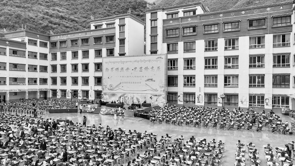 随着主持人一声“开始书写”,千余支笔同时落下。操场上,笔尖摩挲纸张的“沙沙”声此起彼伏,宛如奏响一曲和谐的文化韵律。阳光下,汉字的横竖撇捺尽显风骨,藏文的婉转线条流淌着独特韵味,每一笔每一划都镌刻着中华多元一体文化的丰富内涵与迷人魅力,师生们全神贯注的身影,构成了校园里最美的文化风景线。